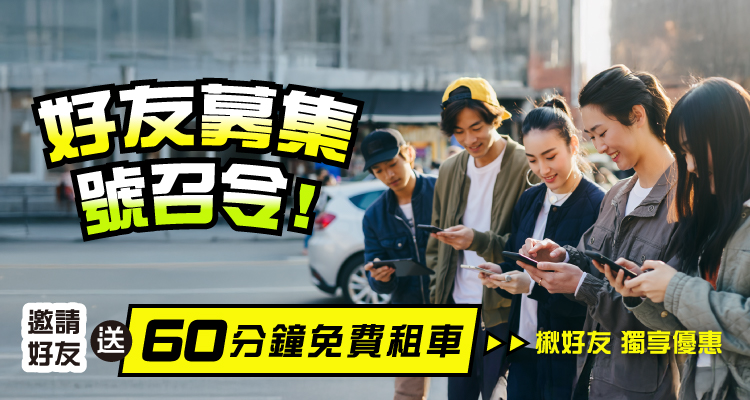 🔹 邀請人及被邀請人贈不分平假日免費60分鐘租車優惠。